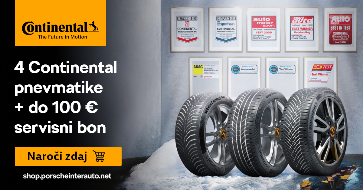 Pri Porsche Inter Auto smo pripravili izjemno priložnost za vse lastnike vozil naših koncernskih znamk v sodelovanju z znamko Continental! V spletni trgovini porscheinterauto.net od 1.10. do 31. 12. 2025 ob nakupu 4 pnevmatike Continental prejmete servisni bon v vrednosti do 100 €. Vrednosti bon lahko uporabite v poslovalnicah Porsche Inter Auto za redno vzdrževanje vozil znamke VW, Audi, SEAT, CUPRA, Škoda. Kupite 4 pnevmatike in si zagotovite vrhunski servis pri Porsche Inter Auto – ekskluzivna priložnost! Ta ponudba velja izključno le za nakupe v spletni trgovini shop.porscheinterauto.net!