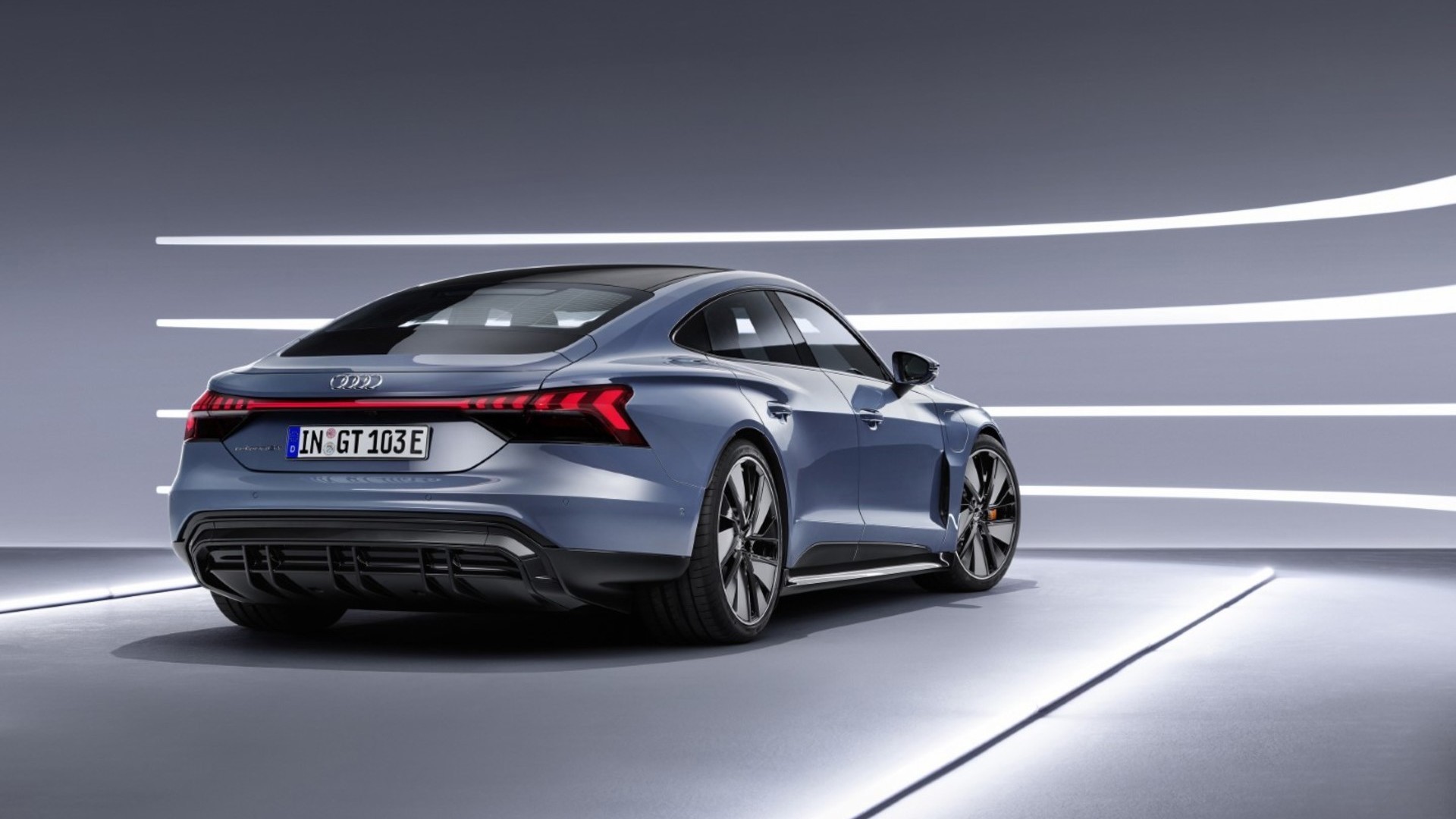 Po celotni širini zadnjega dela se razteza svetlobni segment, ki se na zunanjih robovih zaključi s klinasto oblikovanimi segmenti, ki sledijo designu sprednjih žarometov. Enako velja za osvetljen logotip e-tron, ki je pri modelu Audi e-tron GT nameščen pod svetlobnim segmentom.