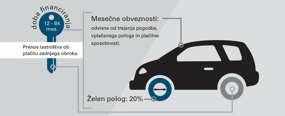 Finančni leasing: Za vse, ki želite po izteku pogodbe postati lastnik izbranega vozila, v času dobe financiranja pa vozilo lahko neomejeno uporabljate. S plačilom zadnjega obroka poravnate vse obveznosti in postane lastnik vozila.