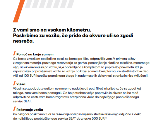 Asistenca za vas brezplačna, če hodite redno na servis k pooblaščenemu partnerju SEAT ali sklenete klavzulo o Asistenci Porsche Slovenija ob zavarovanju.