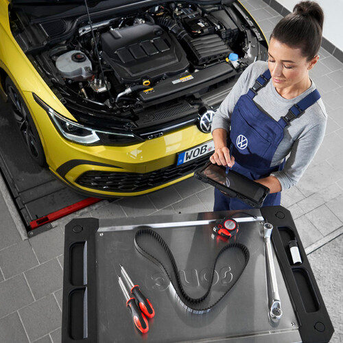 Postopek menjave zobatega jermena najprej vključuje servisni pregled, kjer se določi vse potrebno za zamenjavo, potem pa strokovnjak opravi menjavo zobatega jermena, ki vključuje originalni zobati jermen, črpalko hladilne tekočine, in garnituro zobatega jermena.