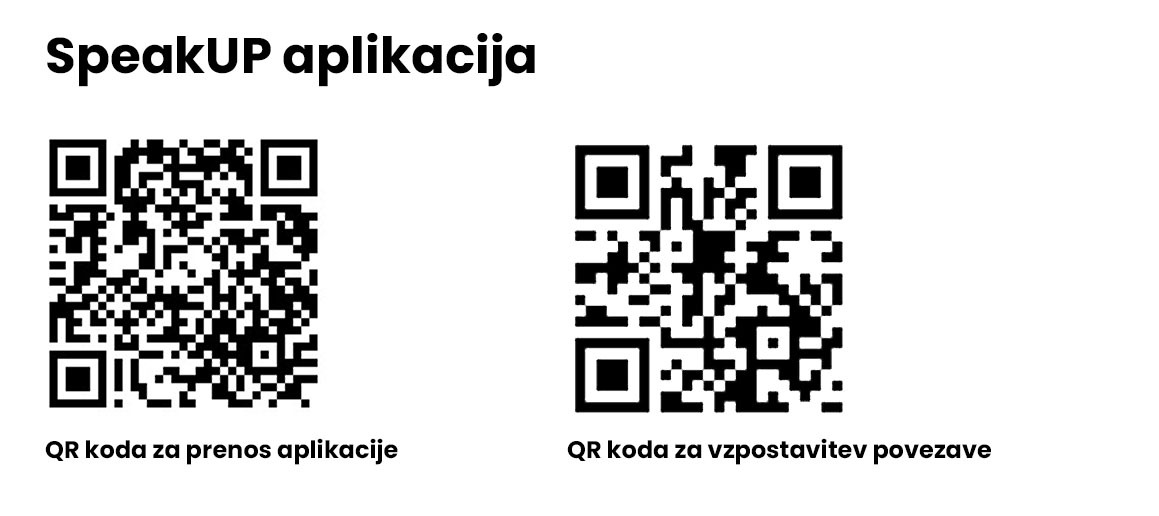 Aplikacijo SpeakUP lahko enostavno prenesete s skeniranjem spodnje QR kode in svojo prijavo oddate neposredno preko aplikacije. Na dnu strani lahko najdete QR kodo za prenos aplikacije. Po prenosu aplikacije ustvarite geslo (PIN), za vzpostavitev povezave pa v aplikaciji vnesite kodo organizacije 122333 ali pa skenirajte QR kodo za vzpostavitev povezave, ki jo najdete na dnu strani.