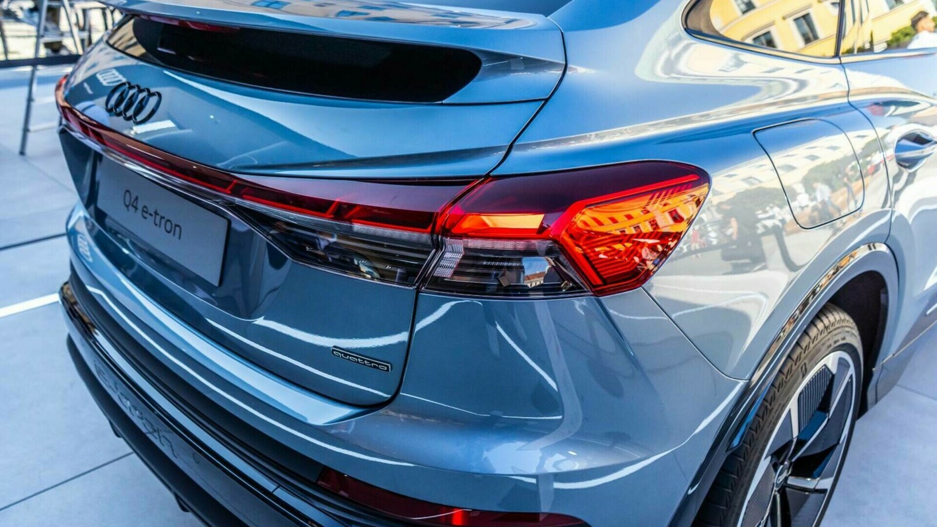 Športni design modela Audi Q4 Sportback e-tron daje prihodnosti električne mobilnosti značilno mogočno obliko. Zdi se, da sta osredotočen sprednji in močan zadnji del vozila pod visoko napetostjo. Zadržana in dinamično padajoča silhueta daje naelektren videz vozila.
