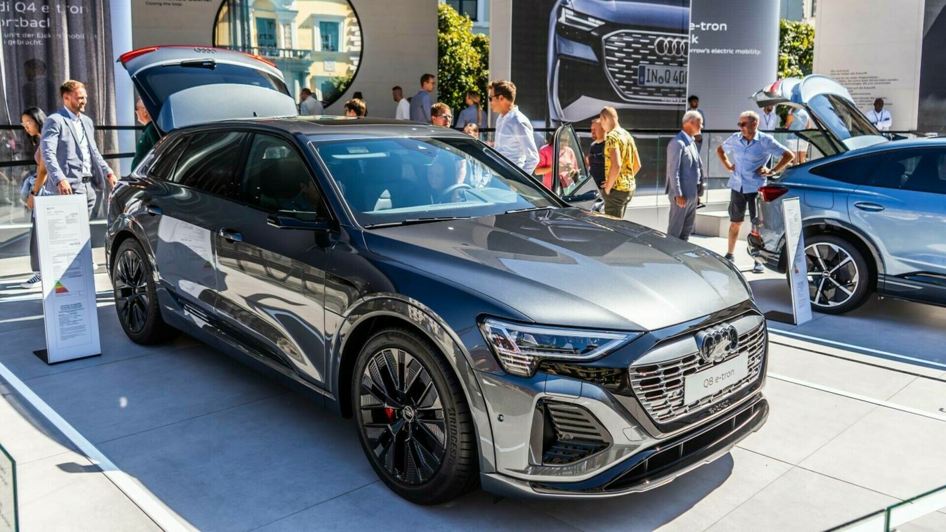 Na avtosalonu IAA München Mobility 2023 je bilo moč videti tudi novi Audi Q8 e-tron s kopico nove tehnologije, Audi Q4 e-tron v posebni različici in pa Audi e-tron GT v izjemni barvni kombinaciji. Po zaslugi večje kapacitete baterije ima novi Audi Q8 e-tron velik doseg. Različica Audi Q8 55 e-tron quattro ima na primer visokonapetostno baterijo s kapaciteto do 114 kWh, kar omogoča, da z enim polnjenjem prevozi do 600 kilometrov (po WLTP).