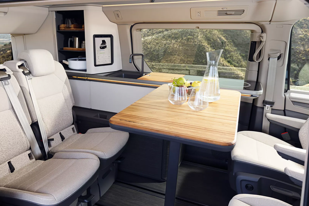Celotni notranji prostor za sprednjima, po višini nastavljivima sedežema, ki ju je mogoče zavrteti za 180 stopinj, je pri vsakdanji uporabi že znani prilagodljivo uporabni potniški prostor modela Multivan. V primerjavi z današnjo Californio so vgrajeni lahki, odstranljivi in zelo udobni enojni sedeži. Zaradi prilagodljivih sedežev je sedaj v notranjosti mogoče lažje prevažati tudi deske in kolesa.