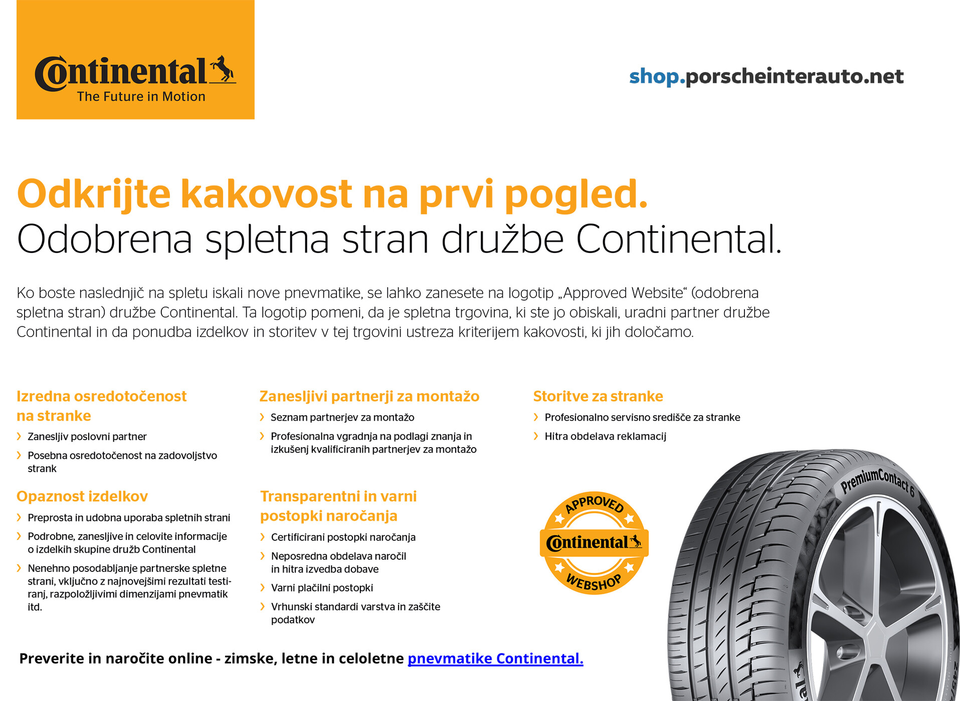 Porsche Inter Auto je eden izmed največjih ponudnikov za pnevmatike Continental v Sloveniji. Sporočamo, da smo pred kratkim prejeli naziv „Continental Approved Webshop“ (certificirana spletna trgovina družbe Continental) - na kar smo še posebej ponosni. Ta logotip namreč pomeni, da je naša spletna trgovina shop.porscheinterauto.net uradni partner družbe Continental in da ponudba izdelkov in storitev v naši spletni trgovini ustreza največjim kriterijem kakovosti, ki jih določa proizvajalec Continental. Porsche Inter Auto je tako prvi in edini avtotrgovec s tem nazivom v Sloveniji (tudi v koncernu Porsche Holding).