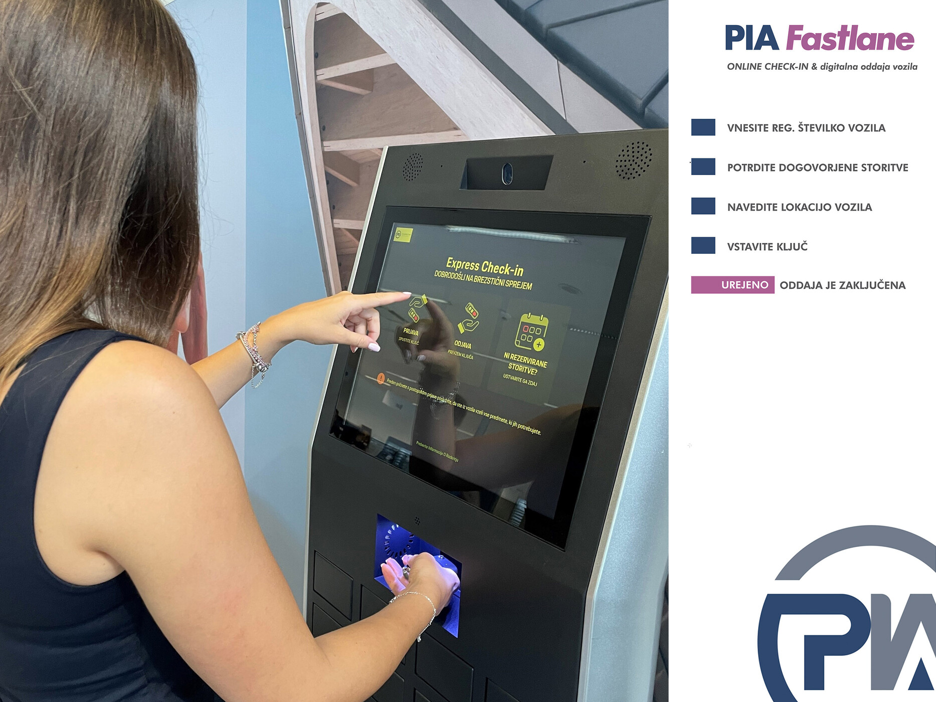 Ko je vozilo pripravljeno, bodo stranke obveščene prek sporočila na mobilnem telefonu. Vozilo lahko prevzamete pri sprejemniku ali tudi ponovno prevzame preko PIA Fastlane. Tudi ta postopek je zelo preprost: na zaslonu terminala Fastlane izberite odjavo vozila in vnesite registrsko številko. Osebna koda za prevzem bo poslana prek sporočila na mobilni telefon. Po vnosu bo prikazana lokacija vozila in ključ se lahko vzame iz odprtega predala.
